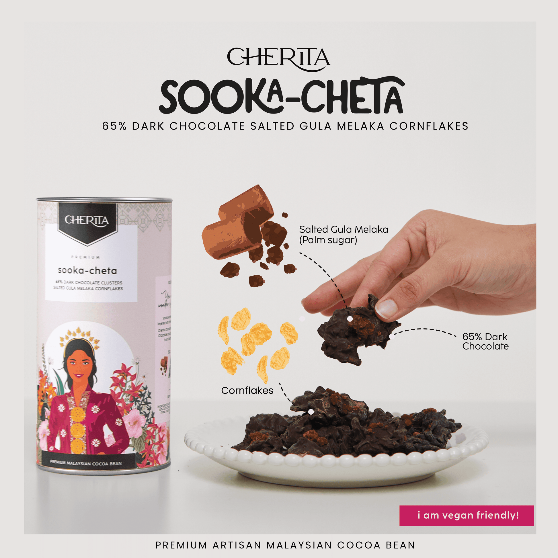 A true Malaysian-inspired indulgence, Sooka-cheta marries the deep intensity of 65% dark chocolate with the nostalgic sweetness of authentic gula melaka and the crunch of golden cornflakes. Lightly salted to enhance every bite, this treat balances bold cocoa notes with the rich, smoky caramel flavour of palm sugar. Crafted with care and 100% vegan-friendly, Sooka-cheta is the perfect harmony of local tradition and modern indulgence—crunchy, complex, and wonderfully addictive.